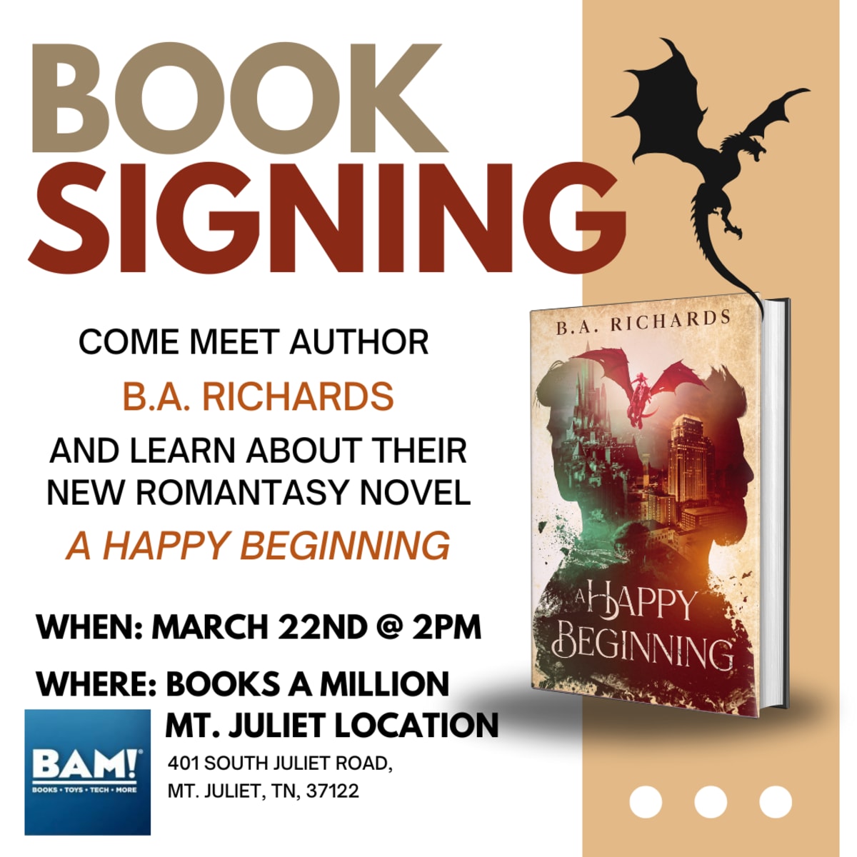 Come to the Mt. Juliet BAM! and grab an autographed copy of A Happy Beginning! There will only be 26 paperback copies available at the store, so make sure you get there on time. If you already own the book, bring it with you!